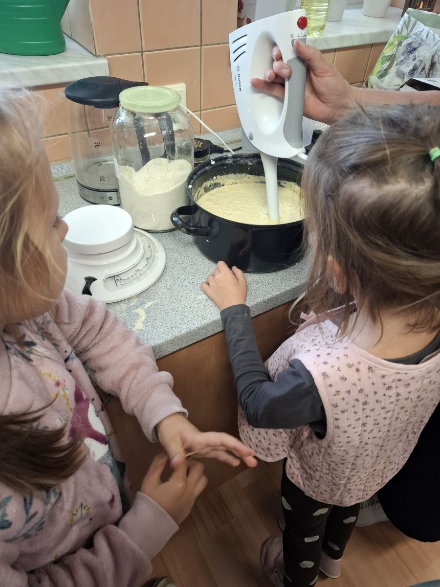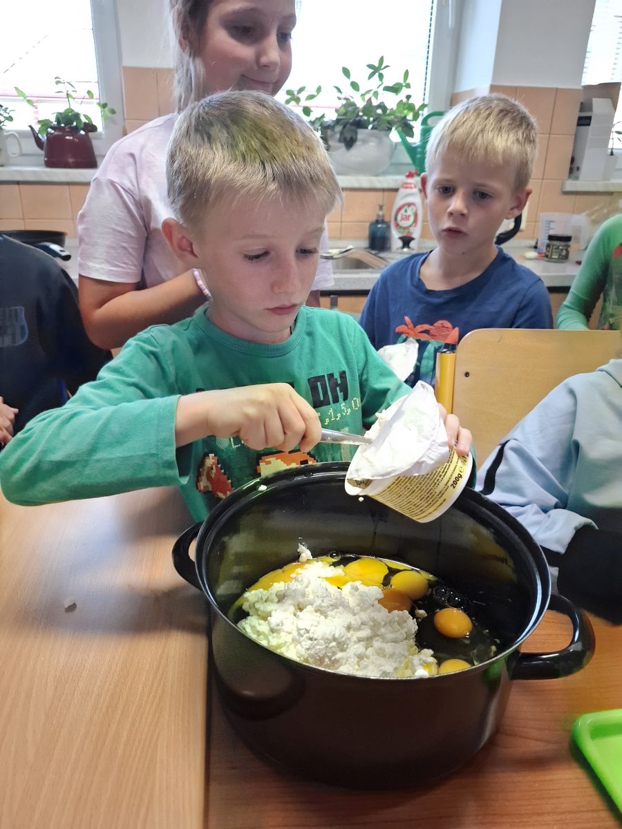 Sýr, vejce a mléko jsme dali do mísy a rozmixovali, přidali mouku a vzniklo hladké těsto. Na pánvi jsme smažili tenké palačinky. Hotové si kuchtíci ozdobili džemem, nutellou a ovocem.